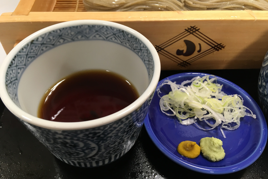 では、さっそくいただきます!きれいですね~艶と独特な色そして盛り方。約10分待っていたのでお腹もいい具合に空いています。きちんとそばちょこに、そばつゆ(予備)もついてきました。まずは一束・・・・・美味い!!!しっかり冷水で締められていてさすがのクオリティーです。何束か食べて、例のゆず七味を投入。ふわっとゆずの香りが鼻を駆け抜け、七味のぴりり感がいいですね~。ゆずを使った香辛料系は間違えなく美味しいさをアップさせてくれますね~。