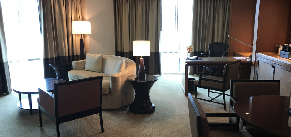 やはりラグジュアリー。部屋も落ち着いた雰囲気でしかもエグゼクティブスイート。一番安い部屋を予約しましたが、ヒルトンオーナーズ「ダイヤモンド」の特典で部屋のアップグレードされたようです。ただ泊まるのは私1人です・・・。広いとても広く快適です。