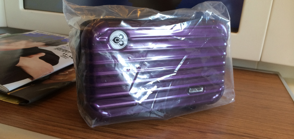 非売品のリモワのポーチ!ファーストクラスに搭乗すると頂けるようです。さすがファーストクラス!雑誌も空間も贅沢に感じます。このアメニティーは何色になるかは運次第らしいです。