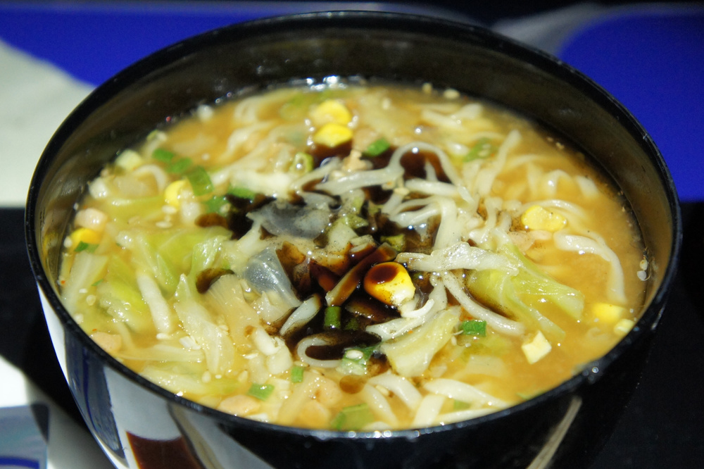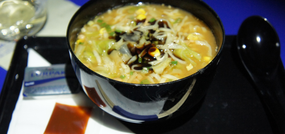 「一風堂ラーメン コク極まる味噌「大地」」です。食べないなんてもったいない!早速注文してみました。軽めのお食事と書いてあったので通常のハーフサイズくらいかと思いきや通常版でした!一風堂は博多ラーメンの名店なので味噌?を不思議な感じがしますが、博多の細面ではなく平めんのちぢれ、やっぱり味噌なんだな~。味は個人的にはみそラーメンって熱々のイメージがありましたが、ぬるめ・・・機内を考慮するとまあまあという評価でした。
